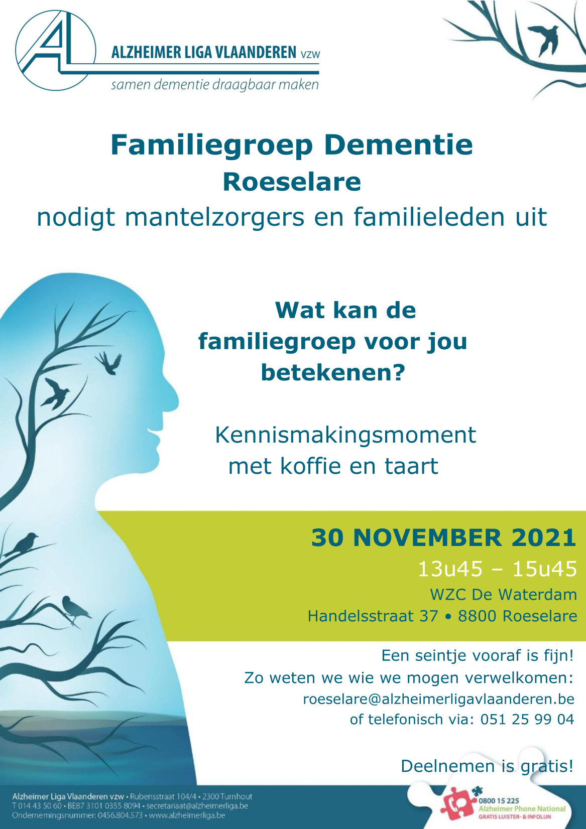 Let op: de familiegroep gaat door in WZC De Waterdam van 13u45 tot 15u45.