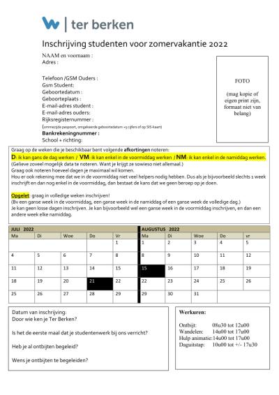Wie geïnteresseerd is om te komen wandelen met onze bewoners kan het inschrijvingsformulier volledig en duidelijk ingevuld terugmailen naar saskia.dermaut@motena.be ofwel opsturen naar WZC Ter Berken, tav Saskia Dermaut, Zijstraat 59, 8800 Roeselare en dit tegen ten laatste maandag 16 mei.